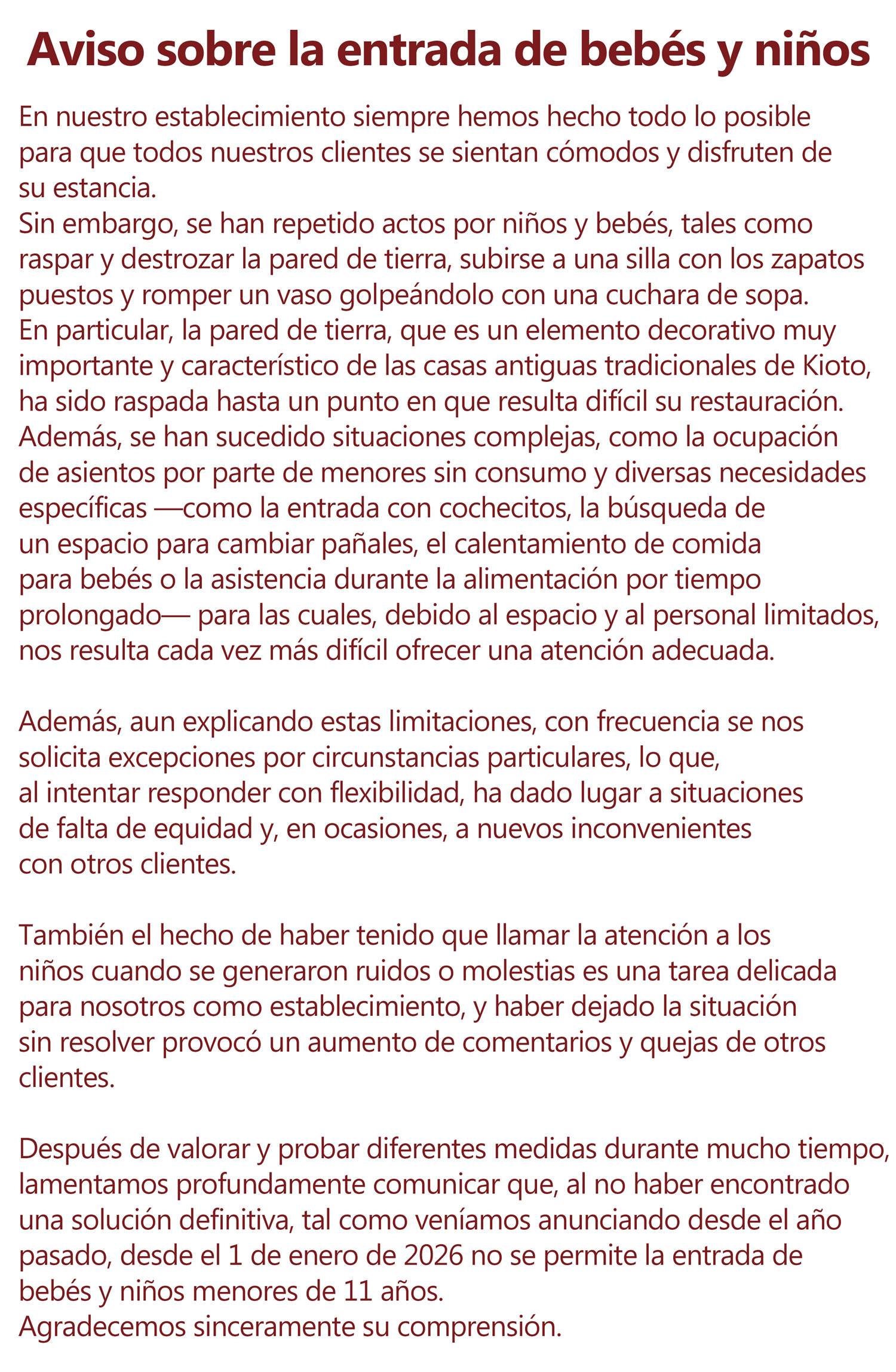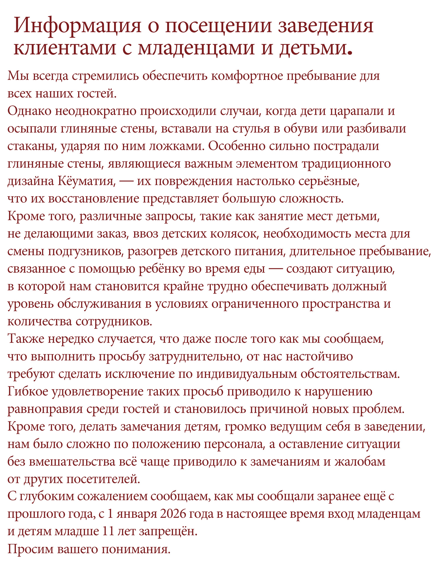 こうした状況を受け、オープン以来、さまざまな対策を検討・実施してまいりましたが、根本的な解決には至らず、誠に心苦しい限りではございますが、去年から告知しておりました通り、2026年1月1日より、乳児を含む10歳以下のお子様のご入店をお断りさせていただいております。何卒ご理解賜りますようお願い申し上げます。
